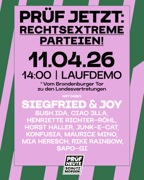 | Am 11.4.2026 findet wieder in den Städten von z.Z. 11 Landesregierungen die "PRÜF!"-Demo statt, wir blicken hier hauptsächlich auf Potsdam und Berlin, aber diesmal wollen auch einige Omas und Opas - trotz Streckensperrung zwischen Potsdam Hbf und Werder - nach Magdeburg fahren, um dort am Morgen die Demo gegen den Landesparteitag der #NoAfD und später die dortige "PRÜF!"-Demo zu unterstützen. |